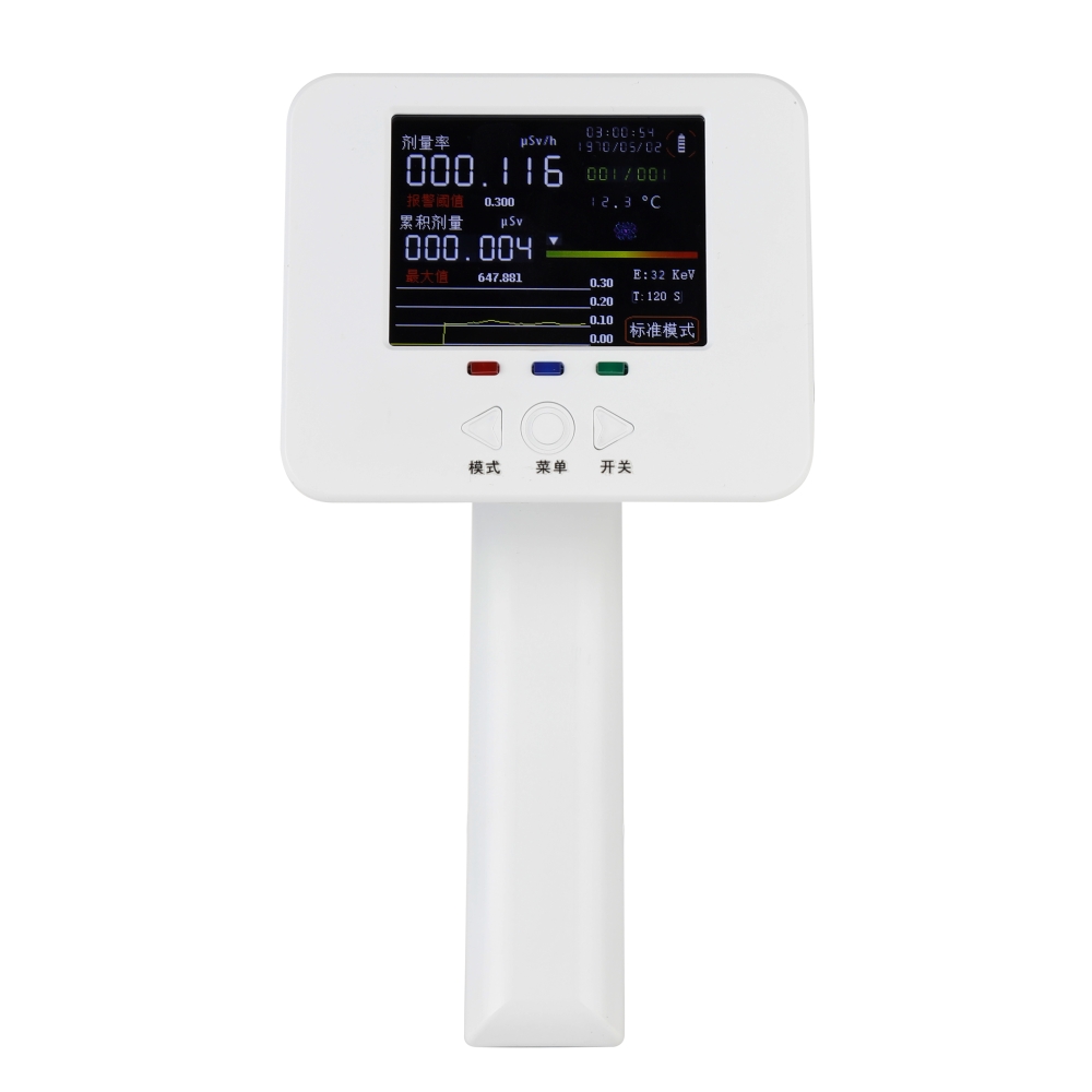 显示:同屏同时显示剂量率,累积量,温度,报警阈值,180秒实时剂量率曲线,最大值,测量模式,实时时钟等信息;